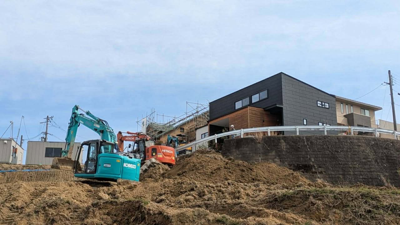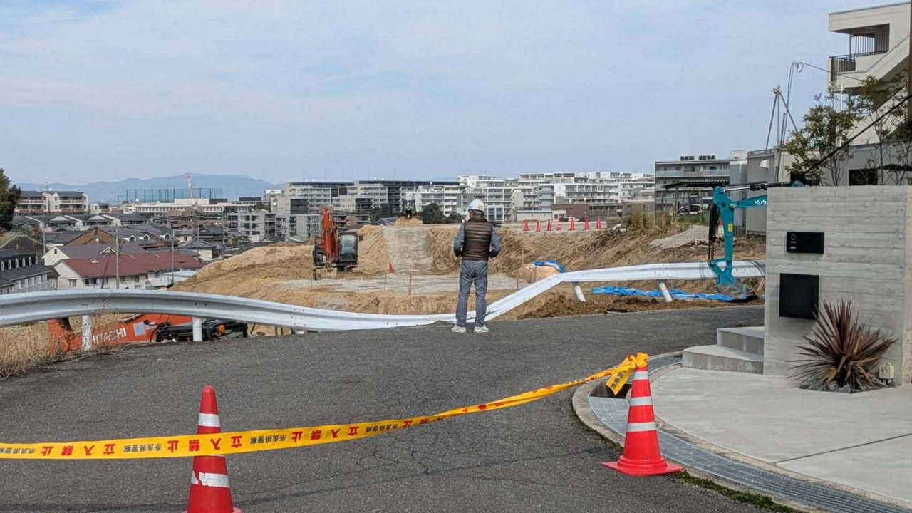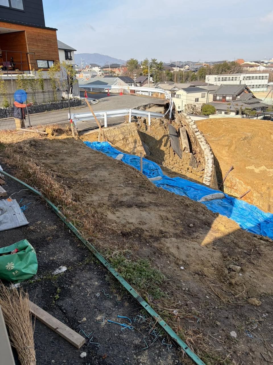 本日早朝に市内で発生した道路陥没事故につきまして経過と現状をお伝えします。本件の発生した現場は写真をご覧いただくと分かる通り、高低差の激しい崖形状になっており、低地の部分で開発業者(県外)による20数戸の宅地開発に伴う造成工事が本年1月から行われていました(2枚目の写真の赤丸のあたり)。 市道の逆L字カーブ部(赤丸の左下)から開発地に向けて進入路を確保しようと工事を進めていたところ、近隣住民から工事に伴い市道にクラックが入っていると通報がありました。市では速やかに開発業者に対し緊急対策を行うよう指導を行い、業者側でも対策工事を実施しようと準備を進めていた矢先に亀裂から擁壁が崩れた模様です。 早朝の時間という事もあり、幸い通行人や工事関係者はおらず人的被害はありませんでしたが、周囲は学校やこども園、福祉センター等もあり、一つ間違えれば大きな被害が出ていた事故でした。 現在は開発事業者において崩れた擁壁を土で固める緊急対策を行っており、一両日中には完了する予定と聞いています。近隣住民の皆様にはご不便をおかけしますが迂回して頂く等、ご配慮をお願いします。