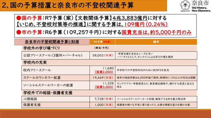 不登校の児童生徒が11年連続で増加し34万6482名となりました。特に近年の増加率は著しく、少子化にありながらこの2年間で約10万人増えています。このような状況を踏まえ、中核市市長会議で私から緊急提言を出させて頂きました。 大急ぎで作った資料ですので表中の数値はいずれも昨年公表された2022年度のデータになりますが、直近の2023年度では小学校で2.14%、中学校で6.71%が不登校ですので、クラスに2-3人は不登校の子どもがいる計算になります。 そもそも不登校が問題なのではなく、登校・不登校に関わらず学びが保証される多様な教育環境が重要な訳ですが、現状、国からの支援や制度は極めて脆弱(来年度の文教関係予算案4兆3883億円のうち不登校いじめ対策費は僅か109億円)であり、奈良市が取り組む施策も大半が市の単独財源になります(約1.1億円のうち国費は僅か500万円) 特に問題なのは、円グラフにもあるように、相談や指導を受けられていない子ども達が約4割に達する事です。発達に支援を要する子ども達も含まれている状況を考えると、進学や就職、その後の社会生活までを見通した、福祉的な視点も含めた国レベルでの対応強化が極めて重要です。 現下の状況に対し、奈良市では独自に公設フリースクール3カ所を始め、校内フリースクール等を順次開設しています。昨今は経済的に厳しい家庭も多い時代ですので、公的サービスとして受け皿を作る事を意識しています。またスクールカウンセラーやソーシャルスクールワーカー等、一部国の補助のある事業もありますが、配置基準や時間数、単価等が不十分な為、市の単費を追加して取り組まざるを得ない現状があります。 ここまで不登校が広がりを見せる背景には、一斉授業型の学びが既に時代に合わない事の表れでもあります。以前は学校に通う事が正解かのような社会認識がありましたが、これからは無理して学校に戻す事にエネルギーを割くのではなく、子ども達が自分らしく学べる環境をいち早く用意する事に注力すべきと考えます。 つくば市の五十嵐立青市長や岐阜市の柴橋正直市長など、先駆的な取り組みをガンガン進めている自治体もありますが、全体としてはまだまだ少数派です。子ども達が産まれた場所によって受けられる支援に格差が生じないよう、中核市市長会を始め様々な枠組みと連携して現場の声を挙げて行きたいと思います。